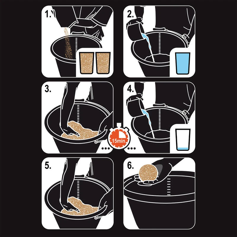 On commence tout d’abord par verser les 3/4 du volume d’eau nécessaire en mélangeant énergétiquement avec la main dans un seau rond pour permettre aux particules de l’amorce de se gorger d’eau.